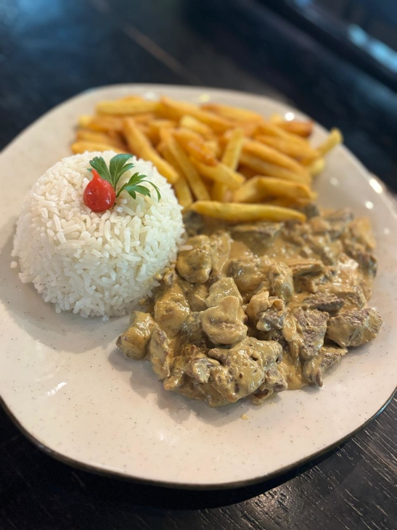 Cubos de file mignon grelhados, envoltos e molho clássico de strogonoff e champignons, acompanhado de arroz e batata frita.
